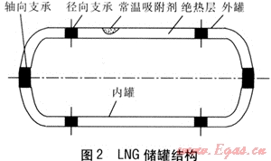橇裝式LNG加氣站的LNG儲罐采用臥式、雙層金屬結(jié)構(gòu)的絕熱低溫儲罐,其結(jié)構(gòu)見圖2。內(nèi)罐一般采用奧氏體不銹鋼材料,如0Cr18Ni9、304等。外罐多采用普通低合金鋼,如16MnR。內(nèi)外罐之間的支承宜采用在低溫下既有較高強(qiáng)度又有較低熱導(dǎo)率的低溫玻璃鋼結(jié)構(gòu)。采用的絕熱方式主要有4種:堆積絕熱、真空粉末絕熱、高真空絕熱、高真空多層絕熱[6]。其中高真空多層絕熱以絕熱空間小、熱導(dǎo)率低、絕熱可靠等優(yōu)勢,在LNG儲罐上得到廣泛應(yīng)用,尤其適用于移動式低溫儲罐。對于高真空多層絕熱,維持夾層的真空度至關(guān)重要。首先,在抽真空時要確保腔內(nèi)材料充分放氣,并確保多層材料層間真空度達(dá)到規(guī)定要求;其次,可在腔內(nèi)放置常溫吸附劑,或采用添加吸附劑的層間隔熱材料,如填炭紙等,以吸附腔內(nèi)材料可能釋放出的少量氣體[7]。
