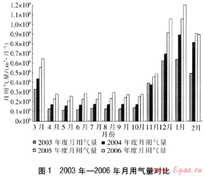 根據(jù)對用氣量與氣溫曲線的分段對比分析,2006年冬季由于氣溫比2005年冬季高,使得2006年冬季用氣增量比2005年冬季用氣增量減少約1000×104m3。
