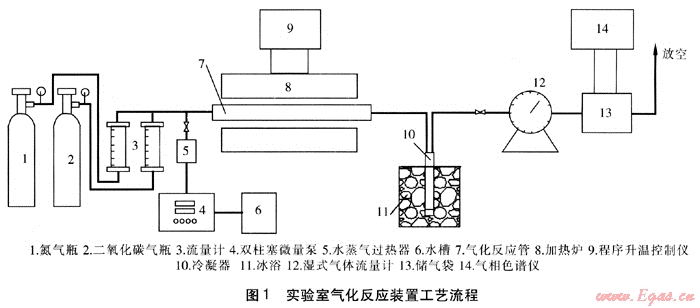 瓶裝氮?dú)饧岸趸細(xì)怏w分別經(jīng)流量計(jì)計(jì)量后進(jìn)入氣化反應(yīng)管;蒸餾水由雙柱塞微量泵計(jì)量后進(jìn)入水蒸氣過熱器,在水蒸氣過熱器中氣化為水蒸氣后進(jìn)入氣化反應(yīng)管;氣化反應(yīng)管由帶程序升溫控制儀的加熱爐加熱到設(shè)定溫度;反應(yīng)產(chǎn)生的氣體產(chǎn)物經(jīng)冷凝器冷凝,除去其中的焦油及水蒸氣,經(jīng)濕式氣體流量計(jì)計(jì)量后進(jìn)入儲氣袋,對儲氣袋中的氣體取樣分析后放空。