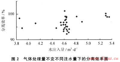 1) 氣體處理量不變條件下,分離效率隨注水量的變化無明顯的規(guī)律可循。但都具有較好的氣-水分離效果,其分離效率在90%以上,平均在95%左右(圖2)。