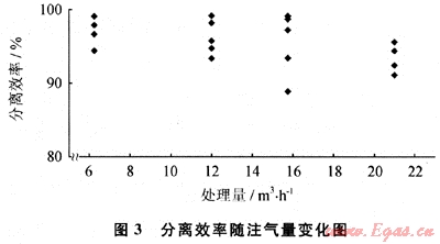 2) 當(dāng)注氣量增加時,分離效率略有降低,但分離效率基本在90%以上(圖3)。