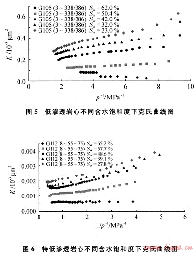 筆者的實(shí)驗(yàn)研究結(jié)果與Rose得到的結(jié)論完全一致,就是氣體在低滲透巖心中的克氏效應(yīng)隨含水飽和度的增加而明顯減弱,其實(shí)驗(yàn)結(jié)果見圖5、6。