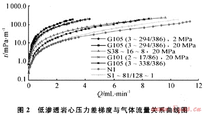 從圖2中可以看出,曲線與縱坐標(biāo)的交點(diǎn)不為0,這一實(shí)驗(yàn)結(jié)果表明:與低滲透油藏一樣,低滲透氣藏氣體滲流過程中確實(shí)存在啟動(dòng)壓力梯度。