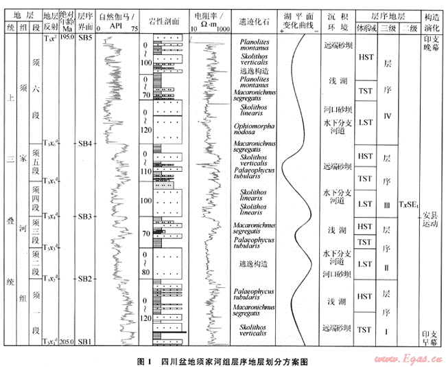 綜合地震、測井、鉆井和野外露頭資料,將須家河組劃分為4個三級層序,每個層序可進(jìn)一步識別出低位、水進(jìn)和高位3個體系域。層序Ⅰ對應(yīng)于須家河組一段(須一段),層序Ⅱ?qū)?yīng)于須二段和須三段,層序Ⅲ對應(yīng)于須四段和須五段,層序Ⅳ對應(yīng)于須六段(圖1)。