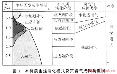 與常規(guī)油氣藏的成藏條件不同,頁巖氣來源由生物成因氣和熱成因氣組成,吸附氣和游離氣并存,具有自生自儲(或短距離運移)的特征。因此頁巖氣聚集受埋藏深度、有機質(zhì)的成熟度及輸導(dǎo)、封蓋條件制約較小。埋藏較淺、有機質(zhì)成熟度低的區(qū)段發(fā)育生物成因的頁巖氣;埋藏深、有機質(zhì)成熟度高的區(qū)段發(fā)育熱成因的頁巖氣;埋藏深度和有機質(zhì)成熟度中等偏低的區(qū)段發(fā)育混合成因的頁巖氣(圖1)。美國第一口頁巖氣發(fā)現(xiàn)井深度最淺,還不足10m,而Haynesville頁巖氣聚集最大深度則近4000m;Antrim頁巖氣的有機質(zhì)成熟度(Ro)僅為0.4%~0.6%,Lewis頁巖氣的Ro則為1.6%~1.9%,頁巖氣聚集的Ro最大可達(dá)3%[24~33]。