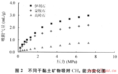 頁巖的主要黏土礦物為伊利石、蒙脫石、高嶺石和綠泥石。不同的黏土礦物對天然氣的吸附能力有著明顯的差別。在30℃溫度條件下,干黏土CH4吸附實驗結(jié)果表明:伊利石和蒙脫石吸附CH4能力明顯高于高嶺石(圖2)[36]。
