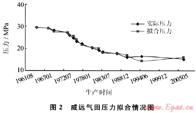 根據(jù)計(jì)算得到的儲(chǔ)量值,可得到威遠(yuǎn)氣田最優(yōu)擬合數(shù)據(jù)及壓力擬合情況(圖2、表2)。