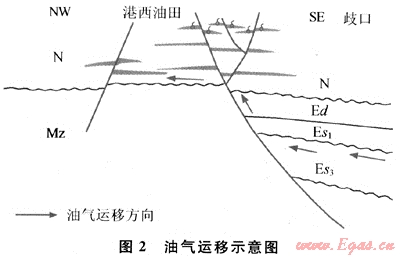 港西地區(qū)斷層發(fā)育,新近系和古近系又是不整合接觸,這為港西凸起的淺層氣從深層往上運移創(chuàng)造了很好的條件(圖2),而且當斷層切過深部油藏時,地層壓力驟然下降,天然氣會不斷地從石油中析出,沿著斷層向上運移,形成純氣藏或氣頂。