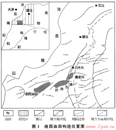 新近系油氣藏為下生上儲,油氣捕獲主要靠連通油源層的斷層[4],港西斷層多為同生斷層,具長期發(fā)育的特點。它是凹陷深部油氣源層向淺層運移的最重要,同時也是最復雜的途徑。凹陷中油氣運移指向一是受古構造控制,即油氣向凹陷中的隆起帶運移;二是受斷裂破碎帶控制,即油氣向破碎帶運移。這是由于斷裂破碎帶是凹陷排出流體的泄壓帶,即油氣運移的“窗口”。凹陷深部生成的油氣通過斷裂破碎帶向淺部儲層運移和聚集,形成多層系的油氣聚集帶[5],港西油田即處于這種斷裂破碎帶上。