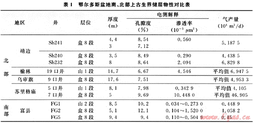 經過對盆地南部上古生界砂體展布的重新認識,認為盆地南部與北部相比具有相近的儲集條件。厚度上,鄂爾多斯盆地南部山西組、石盒子組與北部氣田山西組、石盒子組儲層厚度大致相當;孔隙度上(表1),鄂爾多斯盆地北部氣田的孔隙度普遍小于100,而南部富縣地區(qū)山西組、石盒子組儲層的孔隙度相比略高,一般大于或等于10%;滲透率上,北部氣田的滲透率變化比較大,低的可以到0.29×10-3μm2,高的可以超過10×10-3μm2,南部地區(qū)滲透率更低,盒8段鉆遇最高只有1.52×10-3μm2。這種低滲透率可能是在寬緩的構造背景下,天然氣成藏之后再次成巖形成的[13],經工藝改造可以改善其儲集條件。