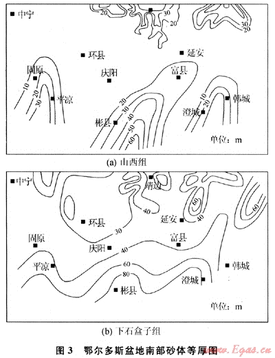 鄂爾多斯盆地下石盒子組主要發(fā)育三角洲平原和三角洲前緣砂體(圖3-b),砂體厚度較大,在30~100m之間,北部砂體分布范圍大,從北部剝蝕區(qū)一直延伸到盆地中南部的環(huán)縣-延安一線。南部相對局限,經渭北隆起到達固原-慶陽-富縣一線。南部砂體在東西上連成一片,總體來看亦具3個物源,由西向東依次為平涼砂體、彬縣-富縣砂體和澄城-韓城砂體。砂體南北延伸距離較小,砂體厚度為40~80m。
