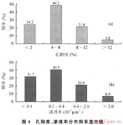 據大量樣品統(tǒng)計,孔隙度、滲透率變化較大:孔隙度為0.8%~20.2%,其中孔隙度為4%~8%的樣品占49.2%,孔隙度為8%~12%的樣品占21.8%,大于12%的樣品占4.8%;滲透率為(0.01~2755)×10-3μm2,其中滲透率為(0.1~0.4)×10-3μm2的樣品占40.5%,(0.4~2)×10-3μm2的樣品占20.9%,滲透率大于2×10-3μm2的樣品僅占6.9%(圖4)。