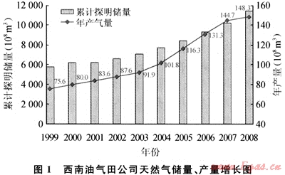 川渝地區(qū)天然氣工業(yè)始于20世紀(jì)50年代。1999年中國(guó)石油重組改制并在境外上市,西南油氣田公司(以下簡(jiǎn)稱公司)負(fù)責(zé)川渝地區(qū)天然氣勘探開(kāi)發(fā)業(yè)務(wù)。經(jīng)過(guò)10年(1999~2009年)的艱苦奮斗,天然氣勘探屢獲重大突破,儲(chǔ)量快速增長(zhǎng),天然氣開(kāi)發(fā)成果卓著。新建產(chǎn)能120×108m3/a(超過(guò)過(guò)去20年的建設(shè)總量),地面輸配氣能力達(dá)200×108m3/a,天然氣凈化能力達(dá)146×108m3/a,2004年天然氣產(chǎn)量突破100×108m3,2006年油氣當(dāng)量突破一千萬(wàn)噸大關(guān),成為國(guó)內(nèi)首個(gè)以天然氣生產(chǎn)為主的千萬(wàn)噸級(jí)大油氣田。天然氣產(chǎn)量從1999年的75×108m3上升到2008年148×108m3,翻了近一番,年均增長(zhǎng)10%(如圖1)。10年累計(jì)生產(chǎn)天然氣1060×108m3,占近50年總計(jì)產(chǎn)量的39%,天然氣開(kāi)發(fā)實(shí)現(xiàn)了跨越式大發(fā)展。