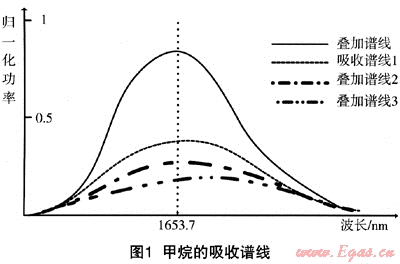 便攜式甲烷激光遙感探測(cè)儀是基于近紅外二極管激光吸收光譜的新型高靈敏度測(cè)量?jī)x器,選擇甲烷分子的強(qiáng)吸收譜線,不受其它氣體成分的干擾,甲烷在波數(shù)6046.96cm-1位置(波數(shù)等于1cm除以波長(zhǎng),即對(duì)應(yīng)波長(zhǎng)1653.7nm)有3條吸收譜線,這3條譜線疊加在一起,形成了一個(gè)強(qiáng)吸收線,如圖1所示。