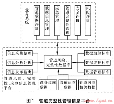 管道完整性管理信息平臺根據(jù)相關(guān)的數(shù)據(jù)組織、維護、管理標準建立管道風(fēng)險、完整性數(shù)據(jù)庫,同時具備信息的采集整理、分析處理和發(fā)布輸出功能。數(shù)據(jù)庫包括設(shè)備設(shè)施數(shù)據(jù)、管道運營數(shù)據(jù)和管道風(fēng)險相關(guān)數(shù)據(jù)。管道業(yè)務(wù)系統(tǒng)包括管道數(shù)據(jù)評價、數(shù)據(jù)信息管理、應(yīng)急管理、管道完整性管理、安全評價、風(fēng)險評價等子系統(tǒng),通過GIS共享管道風(fēng)險、完整性數(shù)據(jù)庫,實現(xiàn)信息的共享、交互、集成。由于管道完整性管理系統(tǒng)是個較復(fù)雜的系統(tǒng),一方面必須從技術(shù)層面上進行信息數(shù)據(jù)的分析、資源優(yōu)化分析處理、信息輸出來實現(xiàn)空間數(shù)據(jù)的共享、融合,另一方面須建立一套完整的風(fēng)險、完整性與應(yīng)急數(shù)據(jù)組織標準、數(shù)據(jù)維護標準、數(shù)據(jù)管理標準來保證系統(tǒng)平臺的正常運行。只有經(jīng)過技術(shù)層面和體制層面的整合,在合理的范圍內(nèi)實現(xiàn)信息和資源的充分共享,才能使天然氣管道完整性管理系統(tǒng)達到最大的使用效益。