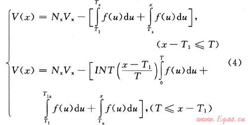 式中V(x)為任意時(shí)刻LNG接收站庫(kù)存水平,m3;Nx為L(zhǎng)NG運(yùn)輸船量,m3;T1為第一次運(yùn)輸船卸船開(kāi)始時(shí)刻;Ts為所求時(shí)刻所屬“季節(jié)”期起始時(shí)刻;T1z為第一次運(yùn)輸船卸船開(kāi)始時(shí)刻所屬季節(jié)期的終止時(shí)刻。