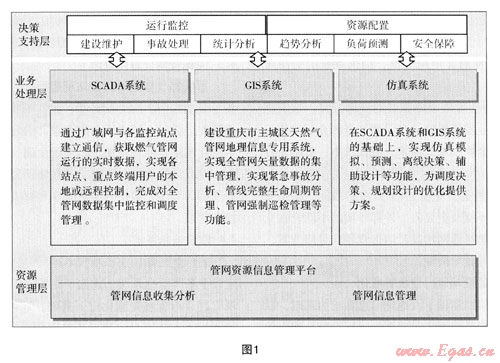 重慶燃?xì)饧瘓F(tuán)隨需應(yīng)變的智慧化管網(wǎng)平臺建設(shè)以科學(xué)發(fā)展觀為指導(dǎo),遵循“高效、科學(xué)、均衡、安全”的天然氣資源配置方針,以信息技術(shù)和自動化技術(shù)為支撐,建設(shè)基于網(wǎng)絡(luò)的智能化識別、定位、跟蹤、監(jiān)控的輸配管網(wǎng),以輸配管網(wǎng)數(shù)據(jù)采集與監(jiān)視控制系統(tǒng)(SCADA系統(tǒng))、地理信息系統(tǒng)(GIS系統(tǒng))、仿真系統(tǒng)為一體的管網(wǎng)資源信息管理平臺,達(dá)到管網(wǎng)運(yùn)行管理的智慧化,支持科學(xué)決策,實(shí)現(xiàn)滿足社會經(jīng)濟(jì)發(fā)展需要、滿足企業(yè)社會責(zé)任需要、滿足客戶需要、滿足企業(yè)戰(zhàn)略發(fā)展需要的隨需應(yīng)變、高效合理的天然氣資源配置目標(biāo),不斷提高資源利用效率,實(shí)現(xiàn)多方共贏。