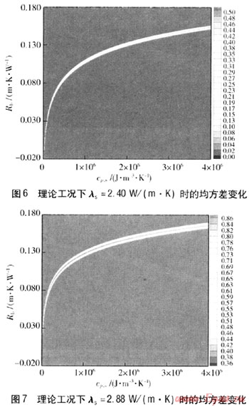 運(yùn)用參數(shù)估計(jì)法,給λs賦值:1.92、2.40、2.88W/(m·K),在參數(shù)估計(jì)中,分別對(duì)cp,s、Rb在一定的取值范圍內(nèi)連續(xù)賦值。通過計(jì)算機(jī)編程計(jì)算得到模擬工況下的均方差變化情況見圖12~14,圖右側(cè)色標(biāo)為均方差。由圖12~14可知,模擬工況下的結(jié)果不理想,均方誤差較小的淺色云圖中深色區(qū)域?qū)?yīng)多組cp,s、Rb,這樣就很難確定哪組數(shù)值是最優(yōu)值,即在參數(shù)估計(jì)中對(duì)其他參數(shù)的影響比較大。