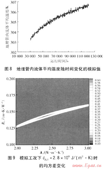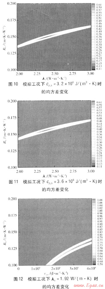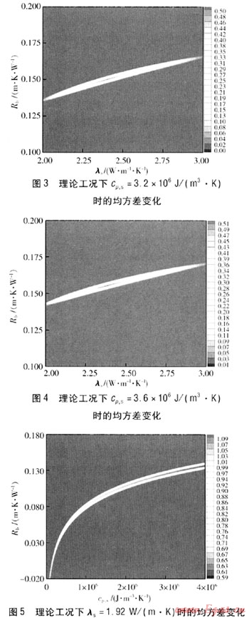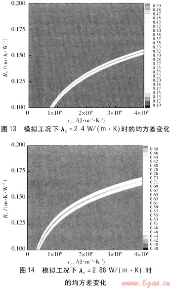 由圖2~4、9~11可知,均方差最小值的區(qū)域基本固定,其對(duì)應(yīng)的λs在2.4W/(m·K)左右。因此,可以得出結(jié)論,在實(shí)際過程中即使存在一些不確定因素的影響,得到的模擬值與理論值存在一定的偏差,但是經(jīng)過參數(shù)估計(jì)處理得到cp,s的變化對(duì)結(jié)果的影響也很小,cp,s偏差±12.5%對(duì)λs的影響在±2%左右。通常情況下cp,s的獲得可以依據(jù)現(xiàn)場鉆孔中心巖土分析來確定,相對(duì)誤差一般在±5%以內(nèi),對(duì)λs的影響更小。