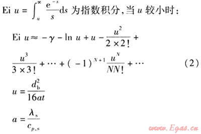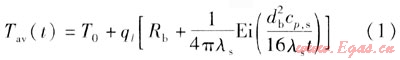 地埋管換熱器的傳熱模型主要有線熱源模型、柱熱源模型。線熱源模型是基于1948年Ingersoll和Plass等人發(fā)展的Kelvin線熱源理論[8]。工程上常見的地埋管換熱器的直徑一般為26~36mm,鉆孔深度為40~200m,與鉆孔深度相比,地埋管的直徑很小。在地埋管換熱器工作時(shí),相當(dāng)于在半無限大介質(zhì)中,鉆孔中心的一根線熱源與周圍巖土進(jìn)行熱交換。另外,假設(shè)沿地埋管長度方向傳熱量忽略不計(jì),周圍巖土均勻且線熱源與巖土的傳熱量恒定。由于該方法不受具體換熱器形式的限制,計(jì)算較簡單,且能滿足一般工程中土壤源熱泵系統(tǒng)設(shè)計(jì)計(jì)算的要求,具有較廣泛的實(shí)用性。根據(jù)假設(shè),可以得到地埋管內(nèi)流體平均溫度與鉆孔周圍巖土初始平均溫度及其他參數(shù)之間的關(guān)系式[9]: