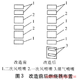 鍋爐原煤粉燃燒器為四角切圓布置,考慮到煤氣燃燒與煤粉燃燒的兼容性和爐內(nèi)空氣動(dòng)力場的穩(wěn)定性,煤氣燃燒器仍以切圓布置方式為宜。經(jīng)計(jì)算,若煤氣燃燒器采用布置在原煤粉燃燒器下的四角切圓燃燒,則要求原煤粉燃燒器下層噴嘴至運(yùn)行層的間距應(yīng)不小于1000mm,而實(shí)際間距僅有700mm,四角切圓方案難以實(shí)現(xiàn)。因此,煤氣燃燒系統(tǒng)最終采用六角切圓布置方式,其中4只煤氣噴嘴直接布置在煤粉噴嘴下部,另外2只煤氣噴嘴布置在左右側(cè)墻的中心,主煤氣輸送管道進(jìn)入鍋爐房后分為兩根煤氣分管道布置于鍋爐兩側(cè),每根分管道再各分出3根支管連接煤氣燃燒器,見圖2。為擴(kuò)大切圓直徑,增加受熱面的吸熱量,降低火焰中心位置,煤氣燃燒器出口軸線分別在原煤粉燃燒器噴嘴出口軸線方向上水平向外偏轉(zhuǎn)20°,向下偏轉(zhuǎn)20°。改造前后燃燒器布置見圖3。綜合考慮低熱值煤氣著火與燃燒的穩(wěn)定性及火焰的長度,煤氣燃燒器采用雙通道煤氣噴嘴,具有部分預(yù)混作用,噴嘴出口煤氣流速約32m/s,空氣流速約35m/s[4~7]。