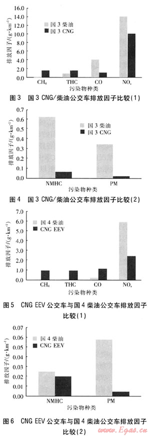 ② 與國3柴油公交車相比,國3 CNG公交車甲烷(CH4)排放增加明顯(增加10倍左右),由此導(dǎo)致總碳?xì)浠衔?THC)排放增加81%。