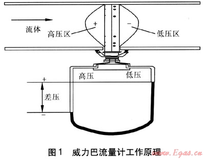 威力巴流量計(jì)采用一種差壓式的流量探頭,其計(jì)算模型和其他差壓式流量計(jì)(如孔板流量計(jì)[7~8])的數(shù)學(xué)模型相同。威力巴流量計(jì)的工作原理見圖1。其計(jì)算模型為: