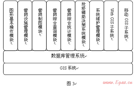 GIS系統(tǒng)主要由圖形基本操作模塊、管網(wǎng)設(shè)施管理模塊(設(shè)備臺賬管理)、管網(wǎng)制圖系統(tǒng)、管網(wǎng)綜合查詢系統(tǒng)模塊、管網(wǎng)綜合統(tǒng)計模塊、搶修輔助決策系統(tǒng)模塊、系統(tǒng)維護(hù)管理模塊、WEB GIS子系統(tǒng)、移動GIS子系統(tǒng)(PDA)等組成。功能模塊見圖3: