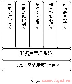 GPS系統(tǒng)主要功能有車輛實時定位、車輛監(jiān)視控制、車輛調(diào)度管理、車輛報警處置、短信語音通信等。功能結(jié)構(gòu)見圖5: