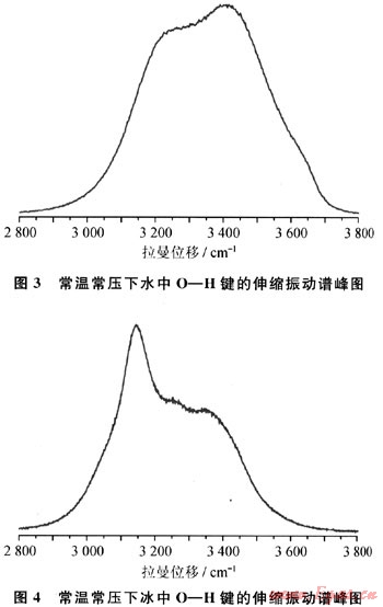 圖3和圖4分別是液態(tài)水和冰的拉曼譜圖。2800~3000cm-1為O—H鍵的伸縮振動(dòng)譜峰,是水的特征譜帶。該區(qū)域內(nèi)寬而高的饅頭峰實(shí)際上是由4個(gè)峰疊加而成的,它們是3241cm-1處的帶氫鍵的O—H鍵的對(duì)稱伸縮振動(dòng)峰,3415cm-1處帶氫鍵的0—H鍵的反對(duì)稱伸縮振動(dòng)峰,3540cm-1處不帶氫鍵的O—H鍵對(duì)稱伸縮振動(dòng)峰以及3617cm-1處不帶氫鍵的O—H反對(duì)稱伸縮振動(dòng)峰[8~11]。各個(gè)峰位代表了分子轉(zhuǎn)動(dòng)或振動(dòng)的頻率,揭示了原子間距和作用力的信息。2800~3000cm-1區(qū)域內(nèi)各個(gè)峰所占的比例,反映了水中氫鍵斷裂的數(shù)目。從圖3可以看出,液態(tài)水中原子間距較大,形成的氫鍵較少,所以3241cm-1和3415cm-1處峰所占比例較小。而圖4所示的冰的拉曼譜圖中,3540cm-1和3617cm-1,處的拉曼峰幾乎消失,這主要是因?yàn)楸兴肿油ㄟ^氫鍵構(gòu)成了四面體結(jié)構(gòu),原子間距較小,氫鍵數(shù)目較多,因而3241cm-1和3415cm-1處峰所占比例較大。