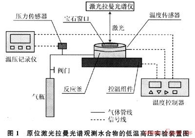 原位激光拉曼光譜觀測(cè)水合物的低溫高壓實(shí)驗(yàn)裝置系青島海洋地質(zhì)研究所水合物實(shí)驗(yàn)室自主設(shè)計(jì)、研發(fā),圖1為裝置的示意圖。整套裝置主要包括供氣系統(tǒng)、反應(yīng)釜、溫度控制系統(tǒng)、數(shù)據(jù)記錄儀、激光拉曼光譜儀等5個(gè)主要組成部分。裝置采用Pt1OOc精密溫度傳感器和半導(dǎo)體控溫,可控范圍-10~30℃,并能夠?qū)崿F(xiàn)梯度控溫。