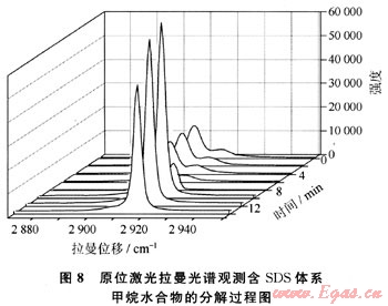 圖8是由SDS水溶液合成的甲烷水合物的分解過程拉曼譜圖。譜圖范圍在2850~2950cm,主要觀測(cè)了水合物的分解過程中甲烷分子的拉曼譜圖變化。從圖中可以看出,由SDS溶液合成的甲烷水合物也為Ⅰ型結(jié)構(gòu)水合物,與干水甲烷水合物分解過程類似,隨著水合物的不斷分解大、小籠中甲烷分子的拉曼雙峰發(fā)生了與干水甲烷水合物相同的變化,甲烷雙峰呈現(xiàn)此消彼長(zhǎng)的過程,并最終變?yōu)閱畏濉?/span>