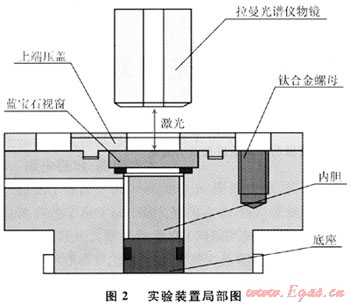 圖2為拉曼光譜原位觀測(cè)裝置的局部圖,拉曼光譜儀的激光透過藍(lán)寶石窗口聚焦在水合物表面,可得到水合物的拉曼光譜圖。反應(yīng)釜分為上下兩個(gè)部分,兩部分的結(jié)合部借鑒了相機(jī)和鏡頭的卡口結(jié)構(gòu),便于開閉。釜體上部的壓蓋采用螺釘壓緊,螺釘、上端壓蓋、藍(lán)寶石視窗以及容器寶石密封端就成為一個(gè)整體。這一部分通過與一個(gè)帶有“O”形圈密封的容器底座結(jié)合,形成一個(gè)密封的壓力容器腔。腔體內(nèi)部設(shè)有內(nèi)膽,容積約1.1mL,用于裝填反應(yīng)介質(zhì)。