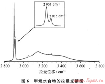 氣體水合物的結(jié)構(gòu)有以下4種:Ⅰ型(立方晶體結(jié)構(gòu))、Ⅱ型(菱形晶體結(jié)構(gòu))、H型(六方晶體結(jié)構(gòu))以及新近發(fā)現(xiàn)的T型(它是由生物分子和水分子生成的),其中前面3種較為常見。Ⅰ型結(jié)構(gòu)含46個(gè)水分子和最多8個(gè)氣體分子,Ⅱ型結(jié)構(gòu)含136個(gè)水分子和最多24個(gè)氣體分子,H型結(jié)構(gòu)含34個(gè)水分子和最多6個(gè)氣體分子。對(duì)水合物結(jié)構(gòu)進(jìn)行分析,主要采用激光拉曼光譜、核磁共振和X-衍射法。Sum等[12]的研究表明激光拉曼光譜是一個(gè)很有潛力的測(cè)定水合物晶體結(jié)構(gòu)的工具,它可以測(cè)定水合物晶腔中氣體分子的伸縮振動(dòng)的拉曼位移(Raman Shift),而且拉曼強(qiáng)度與分子的數(shù)量成正比。圖6為實(shí)驗(yàn)測(cè)得的甲烷水合物的拉曼譜圖,小圖中2905cm-1和2915cm-1附近分別是處于大、小籠中甲烷分子的伸縮振動(dòng)拉曼峰。純甲烷氣體的拉曼譜峰在2917cm-1附近,水合物中甲烷分子的伸縮振動(dòng)峰發(fā)生分裂呈現(xiàn)雙峰,而且向低波數(shù)遷移,這主要是由于水合物中甲烷分子填充在水分子通過氫鍵構(gòu)建起來的籠子中,甲烷分子與大、小籠之間的相互作用不同,所處的化學(xué)環(huán)境存在差異,從而使得甲烷的拉曼譜峰發(fā)生分裂。甲烷分子化學(xué)環(huán)境的差異也說明甲烷水合物中兩種籠型結(jié)構(gòu)的存在。實(shí)驗(yàn)測(cè)得甲烷水合物大、小籠拉曼峰強(qiáng)度(峰面積)的比值基本上都為3:1,這與工型結(jié)構(gòu)水合物晶胞中大、小籠的個(gè)數(shù)比是一致的(工型結(jié)構(gòu)一個(gè)晶胞中包括6個(gè)籠和2個(gè)小籠),由此可以斷定甲烷水合物為工型結(jié)構(gòu)水合物。水合物的拉曼譜圖中,3078cm-1附近的峰是O—H鍵的伸縮振動(dòng)位移,是水合物中與氣體分子相結(jié)合的水的拉曼峰。根據(jù)甲烷雙峰和結(jié)構(gòu)水峰可以很容易地將水合物與自由氣以及冰加以區(qū)分。