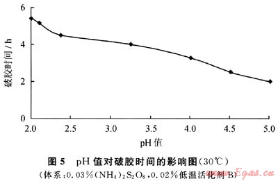 將PAM濃度為0.4%,ZrOCl2為1%的溶液按100:3.5的配比混合,加入相同濃度的氧化還原體系,使用2%HCI將體系pH值調(diào)至不同值,放入30℃水浴測得破膠時間(圖5)。