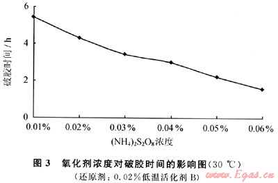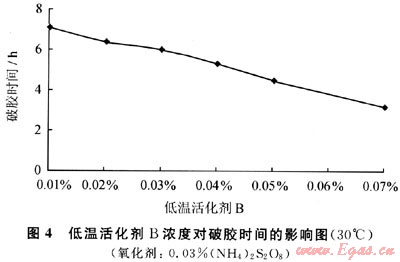 由圖4可以看出,在氧化劑濃度不變,破膠時間隨著低溫活化劑濃度的增加而減少。