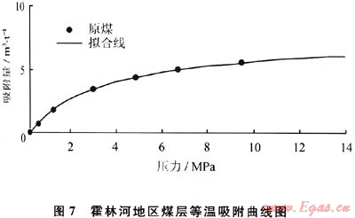 煤的等溫吸附實(shí)驗(yàn)顯示,霍林河地區(qū)煤層的吸附性能較差,蘭氏體積及壓力較小,蘭氏體積為1.7~7.74m3,蘭氏壓力為0.9~3.68MPa(圖7)。測定甲烷δ13C1值為-62%,顯示有生物氣的特點(diǎn),說明該區(qū)煤層氣主要為生物成因氣。因此,雖然該區(qū)煤層熱解氣量小,煤層吸附能力較低,但生物氣的補(bǔ)充與良好的保存條件保證了該區(qū)仍有較高的含氣量與含氣飽和度,對煤層氣成藏有利。