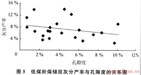 霍林河地區(qū)煤熱演化程度低,還沒有達(dá)到大量生烴階段,煤層氣組分以生物氣為主,含少量煤熱解氣(圖4)。從煤巖煤質(zhì)上看,霍林河地區(qū)煤層鏡質(zhì)組含量高,對煤層氣成藏有利。金振奎等通過沁水盆地分析了灰分產(chǎn)率對煤儲層性能的影響,認(rèn)為無機(jī)物一般充填于煤孔隙及裂隙[10],占據(jù)孔裂隙空間。并根據(jù)之間的關(guān)系統(tǒng)計(jì),得出灰分產(chǎn)率與孔隙度之間呈線性負(fù)相關(guān)。本次研究用低煤階樣品也得出同樣的關(guān)系(圖5):即灰分產(chǎn)率越高,孔隙度越低。低煤階煤層氣氣運(yùn)移通道主要以孔隙型為主。因此對于低煤階煤儲層,灰分含量對煤儲層滲透性有較大影響,灰分越大,煤儲層滲透性越差。