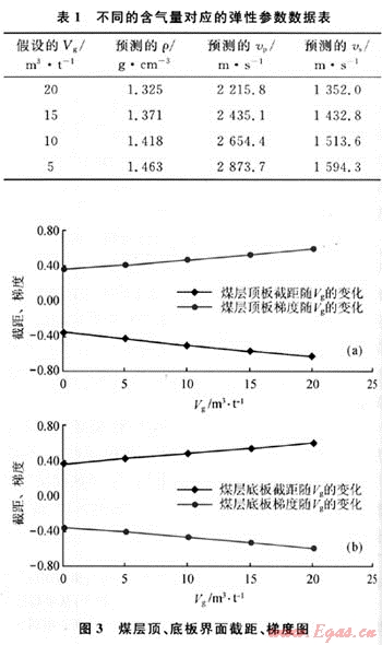 圖3展示了煤儲(chǔ)層頂、底板反射界面情況:頂、底板反射界面的截距、梯度分別是相反的,即頂板反射界面是負(fù)截距正梯度,而底板反射界面是正截距負(fù)梯度[8]。當(dāng)Vg=0時(shí),頂板反射界面的截距為-0.37,梯度為+0.36,而底板反射界面的截距為+0.37,梯度為-0.36;當(dāng)Vg=20m3/t時(shí),頂板反射界面截距減小至-0.61,梯度增大至+0.59,而底板反射界面截距增大至+0.61,梯度減小至-0.59,這種對(duì)稱(chēng)性主要是因?yàn)榈刭|(zhì)模型是對(duì)稱(chēng)的??傊簩禹敯搴偷装宓慕鼐?、梯度的絕對(duì)值隨著煤層含氣量增加而增大。