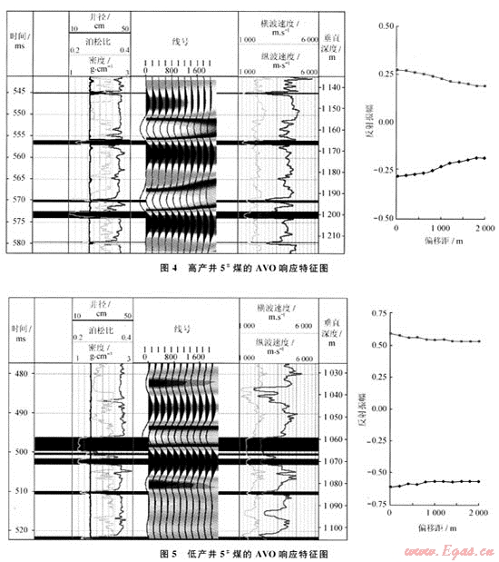 通過(guò)對(duì)煤層氣井的AVO數(shù)值模擬,獲得井的AVO信息,將此信息同地震測(cè)線(xiàn)AVO屬性進(jìn)行比較,以尋找AVO異常區(qū)。選擇離地震測(cè)線(xiàn)較近的井進(jìn)行AVO正演數(shù)值模擬,從井旁CDP道集中反復(fù)提取地震子波,使提取的地震子波與反射系數(shù)進(jìn)行褶積,得到合成CDP道集。將合成CDP道集與實(shí)際CDP道集進(jìn)行比較,誤差值最小的CDP道集即為最終合成CDP道集。然后對(duì)其進(jìn)行AV0反演處理,獲得截距、梯度屬性剖面。在AVO正演數(shù)值模擬獲得的合成CDP道集上,對(duì)應(yīng)5#煤層的同相軸展示了振幅隨偏移距增大而減小的特征,和AVO反演結(jié)果對(duì)應(yīng)的關(guān)系是:對(duì)于負(fù)同相軸,是負(fù)截距、正梯度異常;對(duì)于正同相軸,是正截距、負(fù)梯度異常,這正是煤層氣富集的反映。