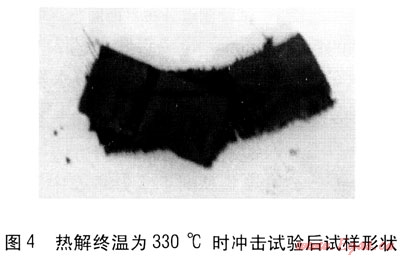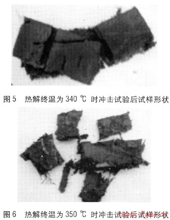 可以看出,隨著熱解終溫的升高,試樣的沖擊韌度逐漸減小。熱解終溫為330℃與340℃時(shí)試樣破碎時(shí)的沖擊韌度沒(méi)有太明顯的變化,在熱解終溫為350℃時(shí)沖擊韌度明顯減小,熱解終溫為360℃時(shí)沖擊韌度減小得更多。熱解終溫為330℃時(shí)沖擊試驗(yàn)后的試樣形狀見圖4,熱解終溫為340℃時(shí)沖擊試驗(yàn)后的試樣形狀見圖5,熱解終溫為350℃時(shí)沖擊試驗(yàn)后的試樣形狀見圖6。