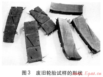 實(shí)驗(yàn)樣品來(lái)自天津市某汽車修理廠的夏利牌轎車的廢舊輪胎,型號(hào)為165/70R 13 79T,廢舊輪胎(含鋼絲和簾布)被切割成大約為7cm×3cm的長(zhǎng)塊,見圖3。
