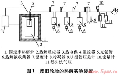 固定床熱解爐由耐高溫不銹鋼材料制成,直徑為200mm,高度為350mm,功率為7.5kW。在固定床熱解爐內(nèi)套有一個(gè)直徑為100mm,高度為150mm的熱解反應(yīng)器,用以盛裝實(shí)驗(yàn)樣品,反應(yīng)器蓋上設(shè)有出氣管、充氮管和熱電偶。為使熱解氣中的可凝氣體充分冷凝下來(lái),冷凝器采用3組U型套管式水冷冷凝器,在其底部裝有桃形分液漏斗,接受冷凝下來(lái)的熱解油,每組冷凝器的進(jìn)出口均設(shè)有溫度測(cè)點(diǎn)。廢舊輪胎的熱解過(guò)程在密閉、微正壓的條件下進(jìn)行,產(chǎn)生的氣體中不含有毒物質(zhì),因此將去除可凝氣體后的不凝結(jié)氣體經(jīng)過(guò)流量計(jì)后,排出室外燃燒。在冷凝器和流量計(jì)之間安裝了U型管壓差計(jì),以便觀察實(shí)驗(yàn)過(guò)程中系統(tǒng)內(nèi)的壓力變化情況。