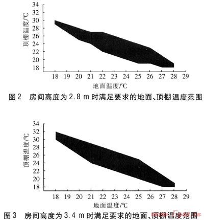對(duì)于房間高度分別為2.8、3.1、3.4、3.7m的房間模型,根據(jù)模擬結(jié)果,求出0.5、1.8m斷面上平均PPD,將滿足要求的地面、頂棚溫度點(diǎn)繪成圖形。其中,2.8m、3.4m高房間的溫度范圍見圖2。