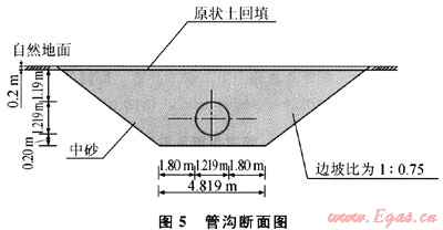 西氣東輸二線(xiàn)輸氣管道罐罐嶺地震斷裂帶施工段采用寬管溝敷設(shè)方式,對(duì)于地震斷裂帶兩側(cè)各30m范圍內(nèi),以斷裂帶為中心,逆氣流方向一側(cè)溝底寬4.819m,管溝挖深4.609m,管溝放坡為1:0.75,管溝底部2.0m深度部分用中砂墊層。順氣流方向一側(cè)溝底寬4.819 m,管溝挖深2.809m,管溝放坡為1:0.75,管溝底部0.2m深度部分用中砂墊層,如圖1、2所示。