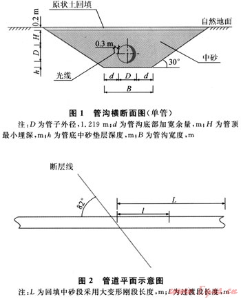 地震斷裂帶兩側(cè)各30m范圍外的管溝開(kāi)挖,按正常管溝開(kāi)挖的要求進(jìn)行施工,即在一般地段管溝挖深不小于2.4m(卵礫石段管溝超挖0.2m),管溝底寬2.0m(石方段管溝底寬為2.4m)。