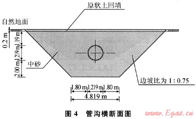 對(duì)于圖3中Ⅰ-Ⅰ斷面的管溝,管溝挖深為4.609m,溝底寬度為4.819m,邊坡比為1:0.75,如圖4所示。