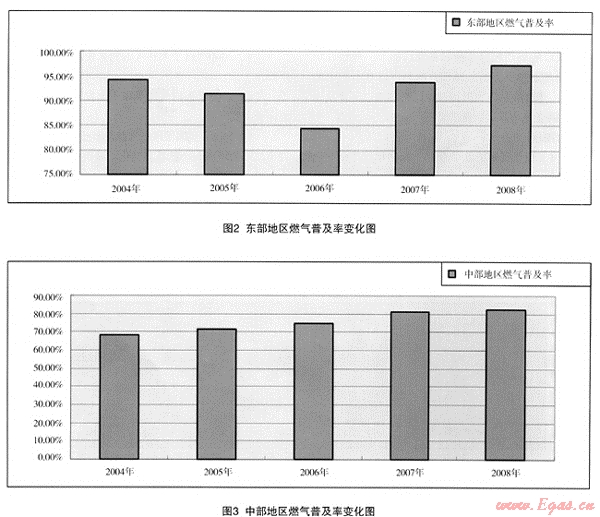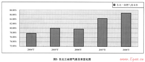 (2) 區(qū)域的燃?xì)馄占奥什⒉荒芡耆砀魇 ⑹?、自治區(qū)的燃?xì)馄占奥仕健?008年的情況看,東部地區(qū)的海南省只有73%,而中部地區(qū)的江西省燃?xì)馄占奥试?0%以上,西部地區(qū)的重慶市也在90%以上。因此,作為規(guī)劃設(shè)計的重要計算數(shù)據(jù)使用時,還應(yīng)該進(jìn)行具體分析,但東部地區(qū)普及率應(yīng)該在全國的平均數(shù)以上。