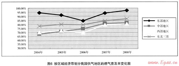 (1) 我國東部地區(qū)的燃?xì)馄占奥士傮w上高于其它地區(qū),其次為東北三省,中部和西部地區(qū)差別較少。西部地區(qū)有資源優(yōu)勢,2005年前,普及率較中部地區(qū)略高,但2006年后,中部地區(qū)又略高于西部地區(qū),證明燃?xì)馄占奥蕪目傮w上看與地區(qū)的經(jīng)濟(jì)發(fā)展關(guān)系較大,其次才是資源因素。