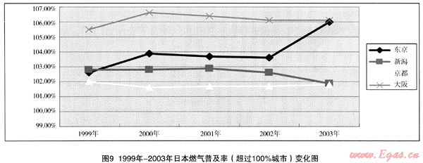 日本東京、新潟、京都、大阪1999年—2003年的燃?xì)馄占奥剩姳?,變化狀況可見圖9。